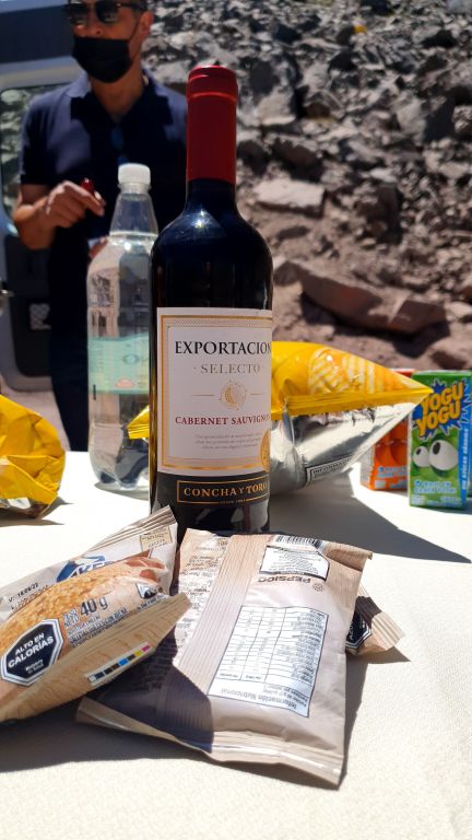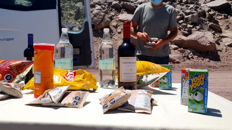 Depois de um tempinho para curtir livremente o local (que eu me arriscaria a dizer que foi de cerca de 30 minutos, apesar de ter perdido um pouco a noção do tempo com tanta beleza) é chegado o momento do piquenique. Boa parte dos passeios com agências turísticas até Cajón del Maipo e Embalse el Yeso incluem esse piquenique, e com a Full Tour não é diferente. Normalmente a refeição consiste em uma tábua de queijos e frios, alguns snacks salgados e doces, além de água, refrigerantes, sucos e vinho chileno.