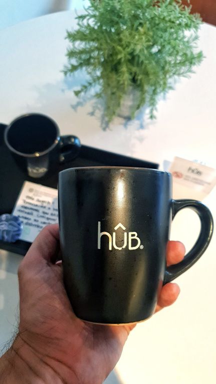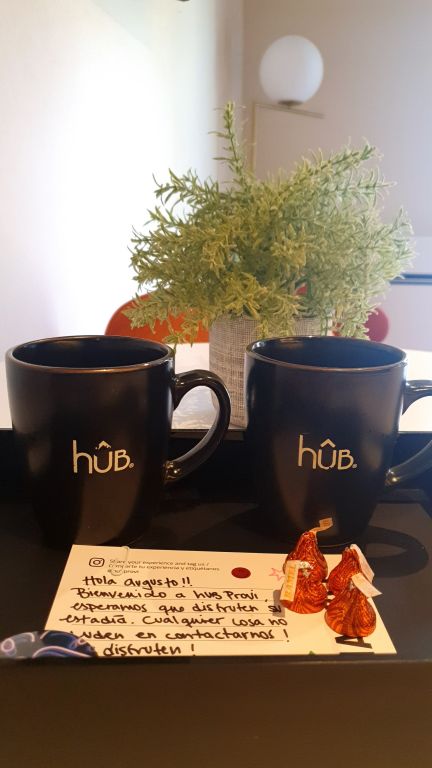 Todo o ambiente segue a linha do hotel com mobília e decoração bem modernas, onde cada detalhe é bem pensado — desde as canecas com a marca do hUB Providencia aos quadros e plantas do ambiente. Detalhe para a cortesia dos chocolatinhos deixados para os hóspedes, mostrando bem o cuidado de toda a equipe em oferecer sempre a melhor experiência.