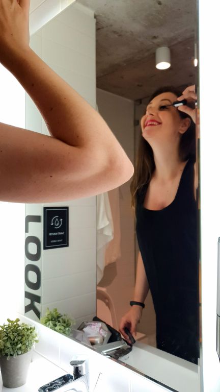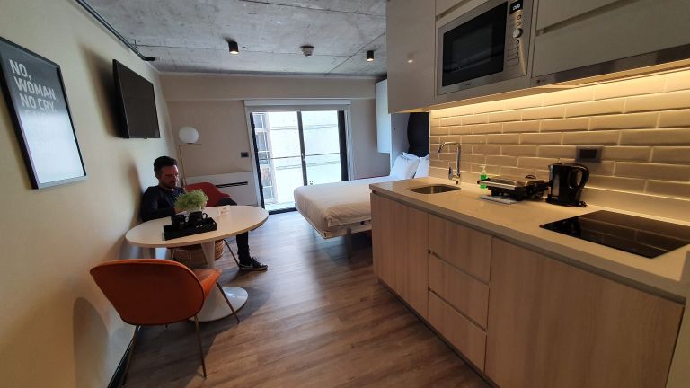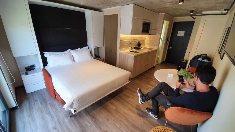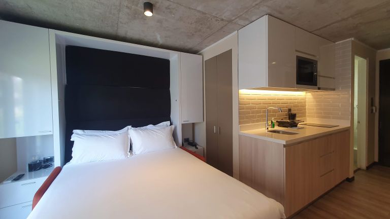 As principais características de “aparthotel” estão na estrutura oferecida pelos quartos, que em sua maioria seguem um estilo mais studio com foco em oferecer, além de conforto, praticidade e modernidade para o dia-a-dia. No nosso caso, ficamos em um quarto da categoria Standard Wallbed Studio, que é praticamente um apartamento completo, com estrutura de cozinha, e que ainda poderia se converter em um escritório para home office durante o dia! Isso mesmo, o design projetado para o quarto permite que a cama possa ser recolhida na parede (daí o “Wallbed” no nome da habitação), e dessa maneira o quarto fica com um super espaço para quem precisar de uma disposição diferente para o ambiente. Demais, não?