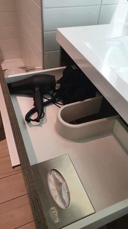 A estrutura de cozinha contava com forno de micro-ondas, fogão de indução com 2 bocas, cafeteira, grill, mini geladeira embutida nos armários e todo um conjunto de panelas, louças e acessórios. Super completa e prática para todas as ocasiões, especialmente para famílias com criança ou para quem tem o hábito de comprar comida no supermercado para economizar nas refeições em restaurantes.