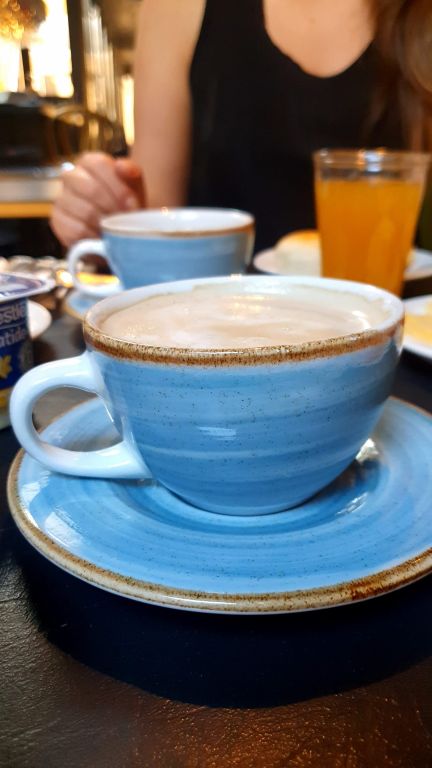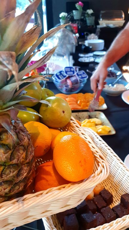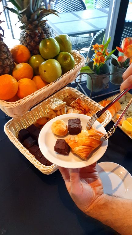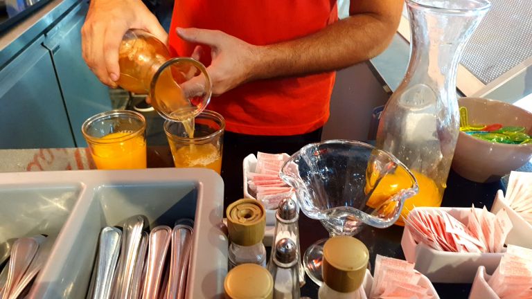 A experiência de café da manhã começa pela escolha das bebidas: sucos (sempre 2 opções) e a bebida quente (chá, café ou café com leite) são servidos diretamente nas mesas.