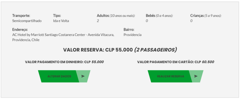 No nosso caso, escolhemos transporte “Semicompartilhado” para ida e volta no hotel AC Costanera Center (localizado no bairro de Providência) para 2 adultos. O orçamento ficou em CLP 55.000 para pagamento em dinheiro (cerca de R$350 para o trajeto de ida e volta) ou CLP 60.500 para pagamento em cartão de crédito. Esse é mais ou menos o mesmo valor dos táxis oficiais do aeroporto de Santiago, com a vantagem de ainda receber um “kit de boas vindas” da empresa no caso de contratar o serviço “ida e volta” (falaremos mais sobre ele na sequência).