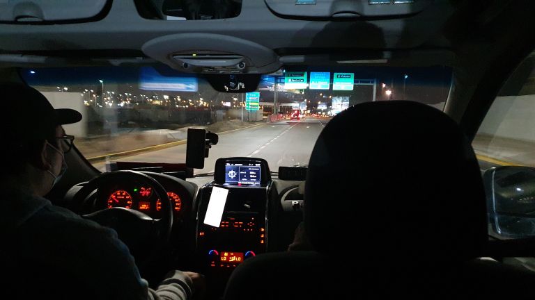 Mesmo com nosso voo chegando de madrugada (por volta de 1h da manhã do horário local), a Transfer Brasil foi pontualíssima e estava lá nos esperando no local combinado, com direito a plaquinha e tudo! Nesse dia, além do motorista, estava ainda a simpaticíssima Fátima, brasileira que mora há muitos anos no Chile e é uma das responsáveis pela empresa.