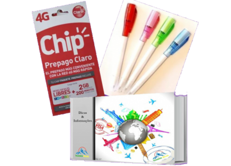 Fechando o Transfer “In e Out” você ganha um kit Bienvenido com: Chip de Celular local (internet e telefone) e guia de dicas e informações de Santiago exclusivo.
