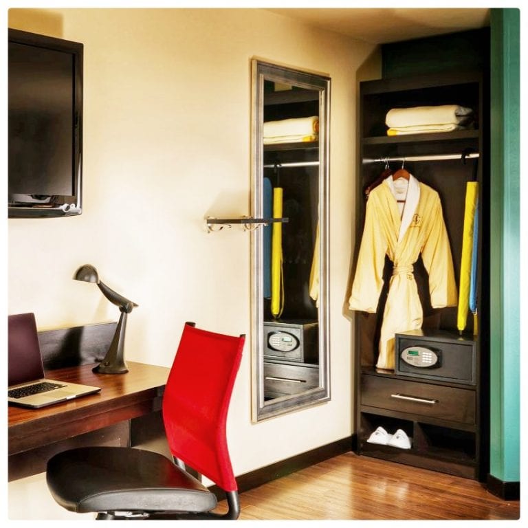 A Wi-Fi de alta velocidade funcionou lindamente e junto com o hub de USB em forma de abacaxi salvaram nossa vida para fazer os uploads de fotos e carregar os equipamentos. Aliás, tomadas por todos os lados e utensílios úteis como o suporte da mala, espelho de corpo inteiro e armário aberto para pendurar roupas. Nesse móvel ainda ficava o cofre,