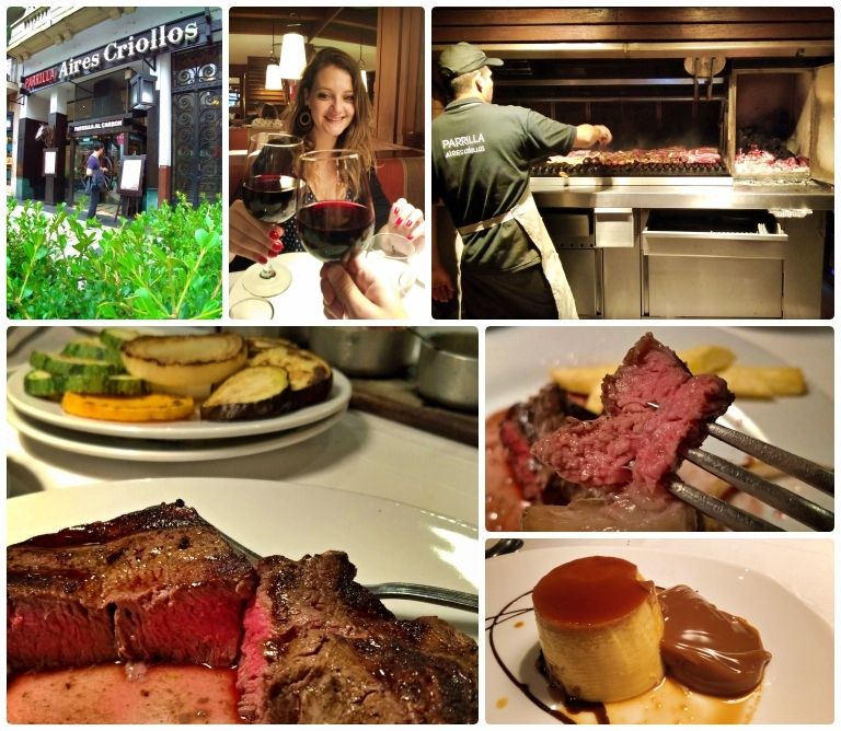 O que pedir: no almoço, peça o Menu Aires que já inclui o cubierto, o prato principal que você pode escolher um dos cortes da parrilla ou uma massa, a sobremesa e uma bebida – taça de vinho da casa ou uma cerveja por exemplo. Recomendamos o bife de chorizo (contra-filé) acompanhado de batatas fritas e legumes da parrilla. O vinho da casa também é excelente e pode ser pedido em taça. Não deixe de provar o flan con dulce de leche de sobremesa! É ótimo!