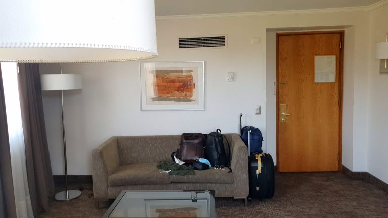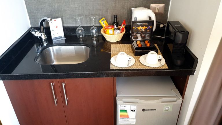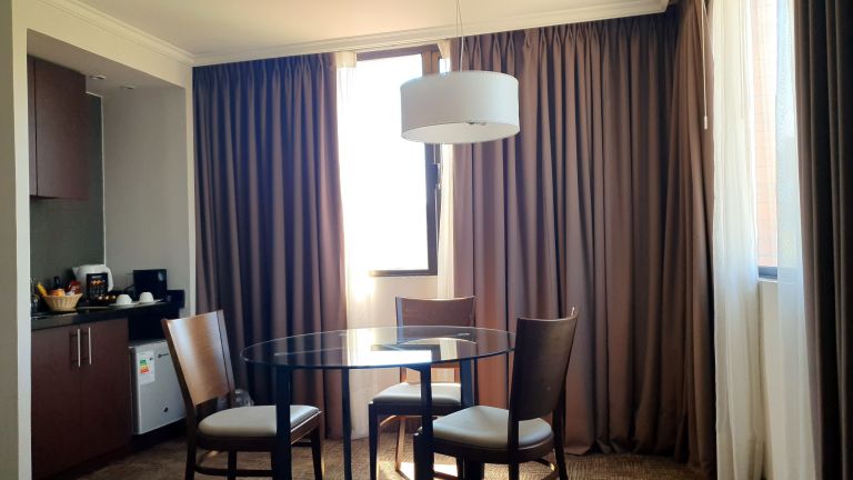 Os 96 quartos do Hotel Director Vitacura são em média bem amplos e com uma planta que remete a um apartamento convencional, ao invés do padrão “studio” da maioria dos hotéis de estilo executivo em Santiago. Nosso quarto (511, localizado no 5º andar) tinha ambientes muito bem divididos: a entrada era pela sala, com sofá, televisão, mesa de jantar redonda e uma mini cozinha (com pia, frigobar, cafeteira e alguns snacks). Todos os itens para consumo eram cobrados a parte.