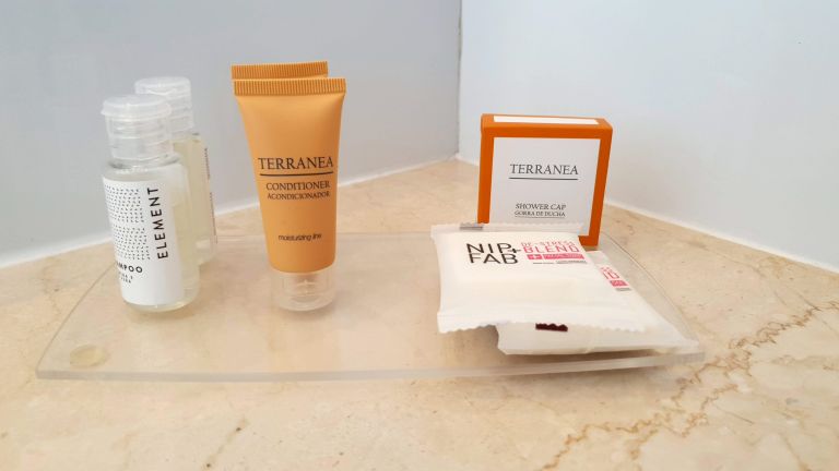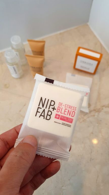 O banheiro segue o estilo do quarto: amplo e numa linha mais clássica, com chuveiro de banheira, pia com bancadas de mármore, tudo muito clean e minimalista. Os produtos de higiene eram da marca nip + fab, e o kit contava com o básico: sabonete, shampoo, condicionador e touca de banho, além de secador de cabelos a disposição.