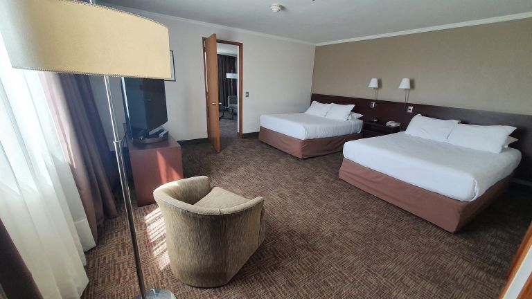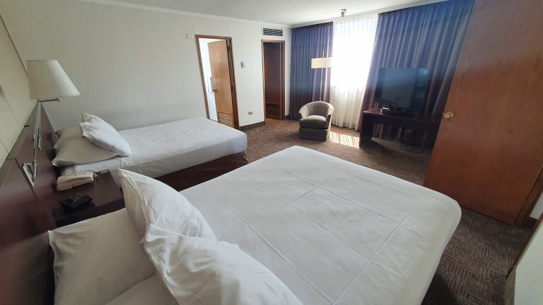 Diferentemente do lobby e das áreas comuns, os quartos tem um estilo de decoração um pouco mais clássico / antigo e minimalista, sem muitas cores ou objetos de decoração, mas com área bem acima da média dos demais hotéis de Santiago. Apesar da decoração mais simples, tudo estava muito limpo e bem conservado. É um quarto com foco no conforto do hóspede, de literalmente fazer com que a gente se sinta em casa.