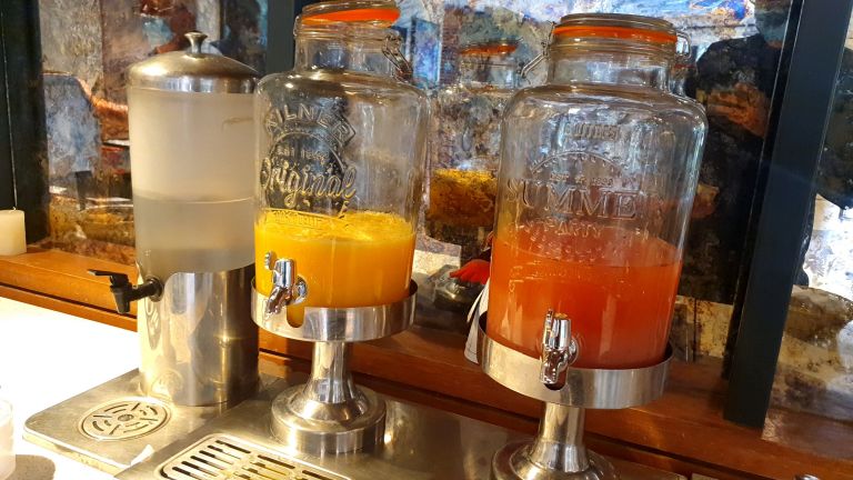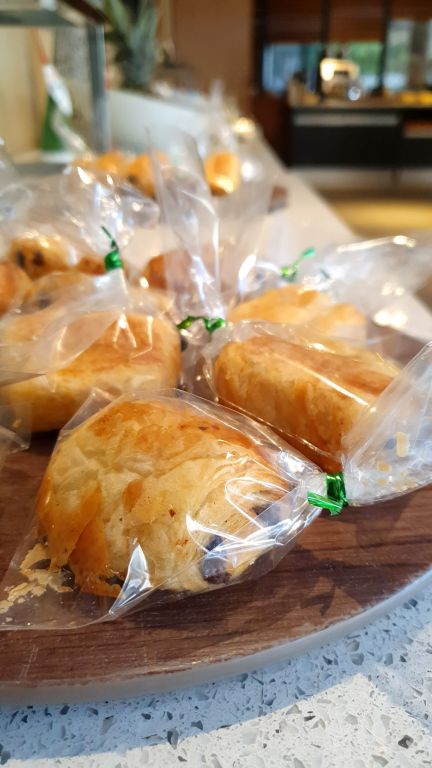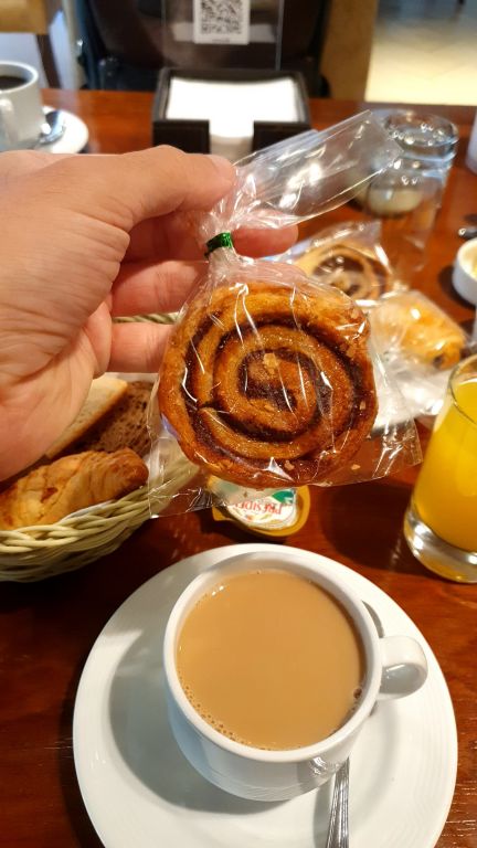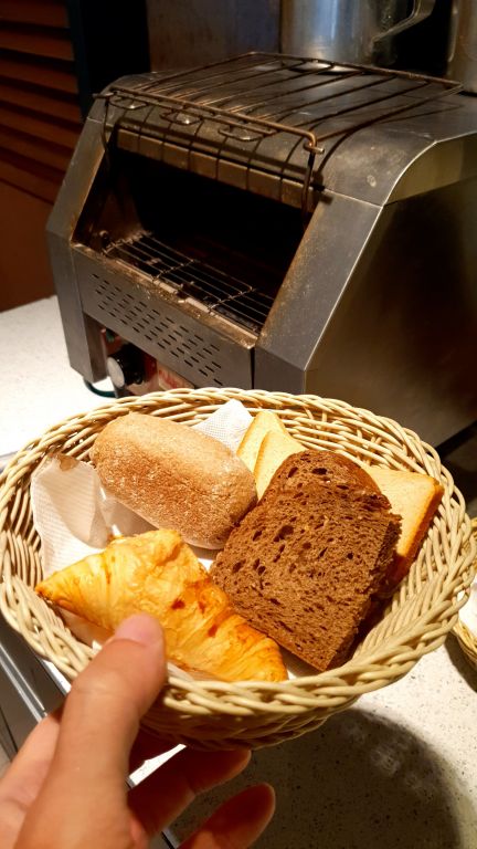 Na parte dos pães, cestas com 4 variedades de pães (pão de forma, integral, francês e croissant) com a possibilidade de esquentar na hora no forno elétrico. As opções de pães doces variavam a cada dia: na primeira manhã havia cinnamon rolls (pão de canela), e no segundo dia um pain au chocolat. É interessante a proposta da embalagem individual de cada item, tanto por questões de higiene quanto para quem gosta de levar para comer mais tarde.