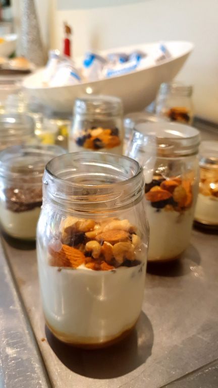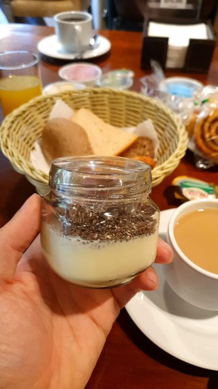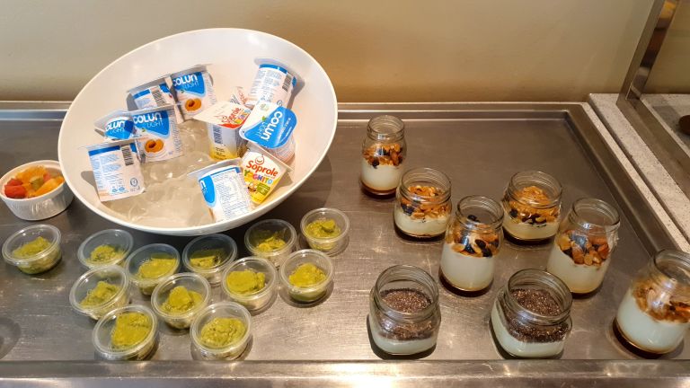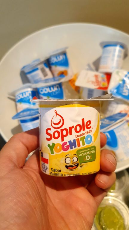 O setor de iogurtes era um dos mais caprichados do buffet, com opções de escolha desde iogurtes mais industriais até potes de iogurte natural com chia ou com nuts, passas e castanhas em geral. Destaque ainda para os potinhos com “palta” (abacate), uma tradição dos cafés da manhã no Chile (mas para comer com pão).