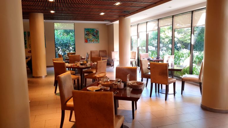 O café da manhã do Hotel Director Vitacura é servido no andar térreo, em um buffet no espaço do restaurante. Há ainda um pátio externo super agradável e iluminado, especialmente nos dias de sol, onde também é possível tomar o café da manhã em uma das mesas e sofás.