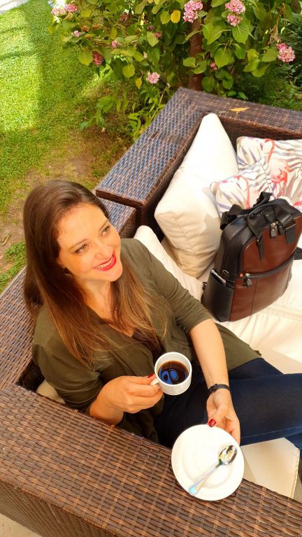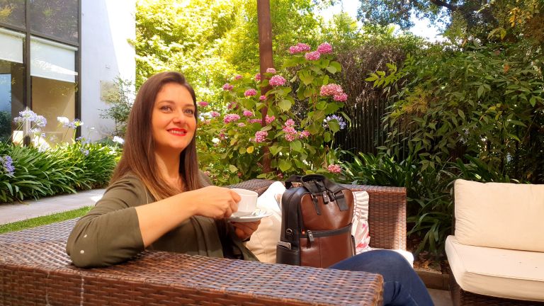 Claro que em uma das manhãs a gente aproveitou um pouco da área externa para curtir aquela última xícara de café antes de seguir para mais um dia explorando a cidade de Santiago.