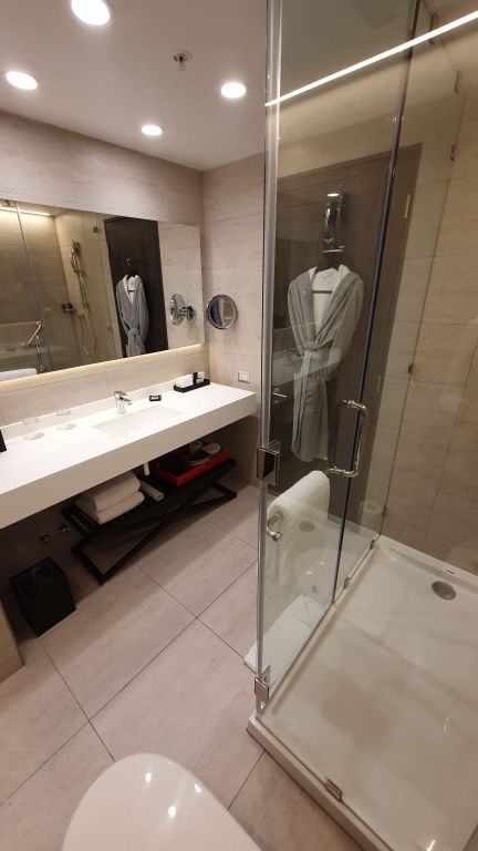 O banheiro segue na linha “classuda” característica do hotel, com decoração bem clean, muito espaço e ótima luminosidade. O chuveiro do tipo chuva é tudo que a gente precisa depois de um dia de atividades por Santiago!