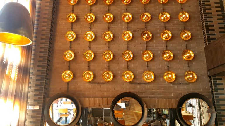 A decoração mescla elementos de estilo industrial (como a parede de luminárias) com fotografias artísticas e muitos detalhes em madeira, dando ares ao mesmo tempo de modernidade e aconchego ao espaço.