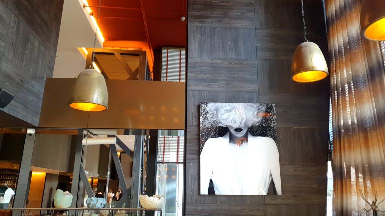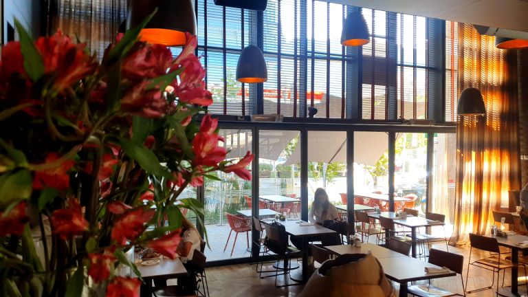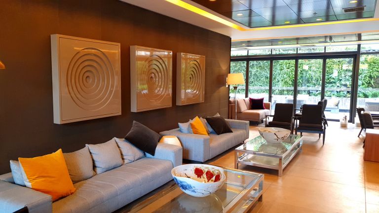 O espaço do lobby do hotel funciona de maneira bem integrada ao bar e ao restaurante onde é servido o café da manhã, que mostraremos em detalhes mais adiante quando chegarmos nesse tópico.
