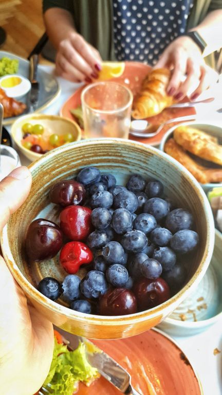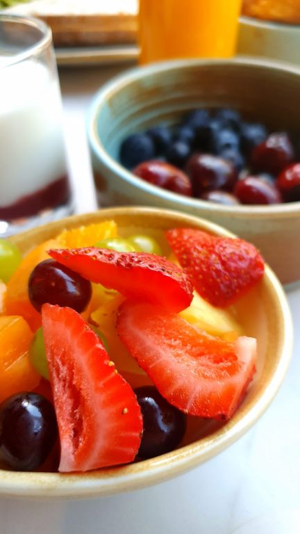 Algumas frutas mais “nobres” são servidas já processadas em porções individuais (morangos, uvas, melão “cantaloupe” e abacaxi). Destaque para as cerejas e mirtilos (arándanos em espanhol), frutas típicas do Chile servidas em generosas porções. Para quem está acostumado com mirtilos frescos no Brasil, os chilenos parecem uma outra fruta, muito mais doce e macio — vantagens de comer a fruta fresca na região em que ela é cultivada.