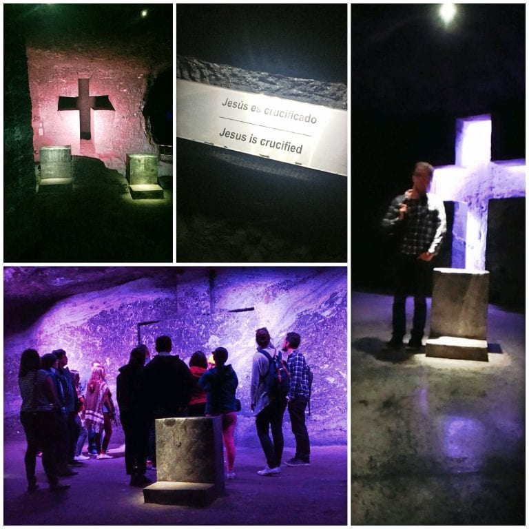 A primeira parte da visita a Catedral de Sal corresponde a representação da Via Crúcis. Pelo longo corredor inicial, passamos pelas 14 estações que correspondem ao trajeto percorrido por Jesus carregando a cruz. Cada uma delas possui altares talhados em rocha de sal, com representações de cruzes, placas explicativas e uma belíssima iluminação – que dá uma aura única ao local.