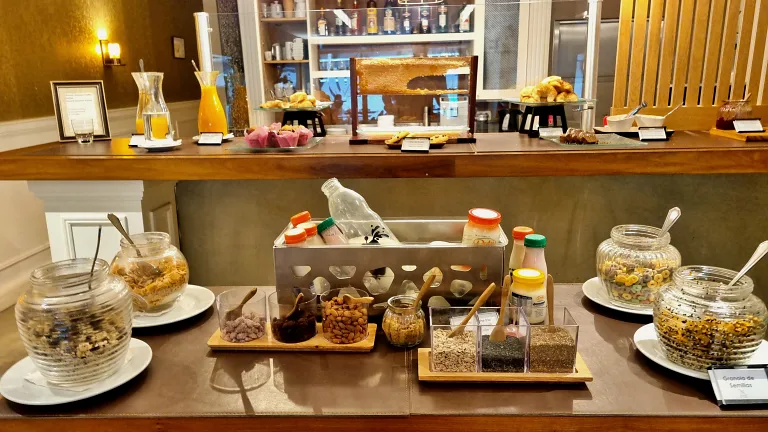 No térreo do hotel Nuss Buenos Aires Soho você encontrará o Deli Lounge, um espaço versátil, onde é servido o delicioso buffet de café da manhã. Ao sair do elevador, o aroma de pão quentinho e café fresquinho já anuncia o que nos espera: um ambiente aconchegante que é um verdadeiro convite para desfrutar da deliciosa experiência que é o “desayuno” do Nuss. O cardápio é variado e saudável, primando por opções muito frescas e caseiras, algumas preparadas na hora seguindo o padrão requintado do hotel. Sem dúvida, o café da manhã desse 4 estrelas conquistou nosso coração (e nosso estômago).