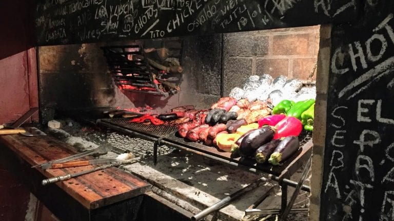 Com esse clima e esse visual, não poderíamos pedir outra coisa senão o braseiro completo, com os cortes típicos como ‘vazio’ (fraldinha) e ‘asado de tira’ (costela), além de ‘chorizos’, ‘morcillas’ e as verduras assadas direto na brasa. Ainda vinha para acompanhar uma mega porção de ‘papas rústicas’, batatas fritas feitas na hora (nada de batata congelada).