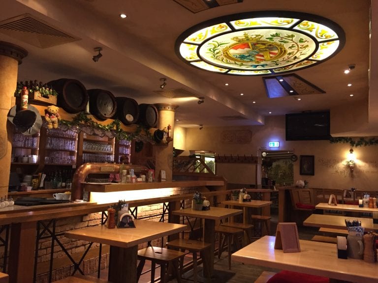 O imenso salão interior segue a linha “taberna rústica”, com muitos detalhes em madeira e decoração típica. O espaço conta ainda com um pátio interno bem iluminado e mesas espalhadas na calçada em frente à entrada principal ao melhor estilo biergarten. Tudo exatamente no padrão que temos em nosso imaginário de como deveria ser um clássico restaurante alemão.