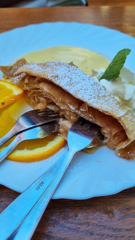 No final, ainda tivemos forças pra dividir um apfelstrudel sensacional (um dos melhores da viagem), que vinha com chantily e sorvete. Esse tava tão bom que não teve nem foto, mas pode confiar, valeu muito a pena. A conta no final deu exatos 37,50 para o casal. Bem justo para toda a qualidade da experiência que tivemos.