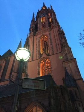 Quando saímos do mercado já estava escurecendo (e esfriando). Estávamos a poucos metros da DOM, a catedral de Frankfurt, e aproveitamos pra caminhar até ela.