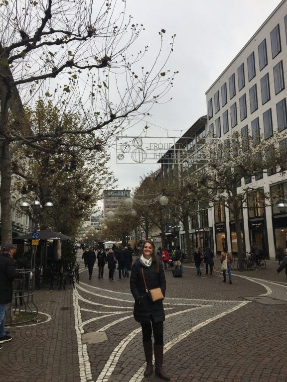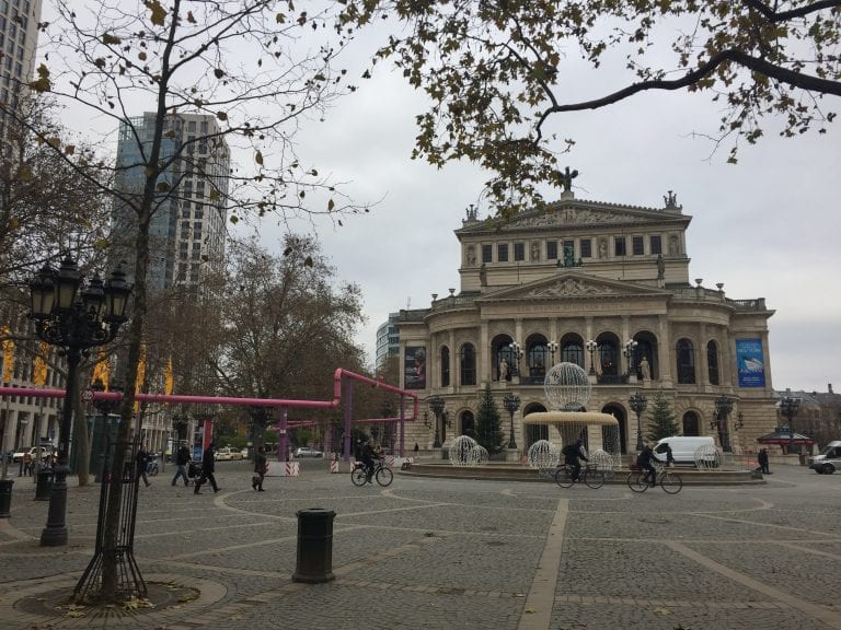 Nesse dia fomos caminhando a pé desde o hotel até a região da Alte Oper Frankfurt. Eram cerca de 25 minutos de caminhada e aproveitamos pra conhecer melhor a cidade em si, as ruas mais residenciais, enfim, viver um pouco como os locais. A Alte Oper é uma construção belíssima, e o chafariz em frente estava todo decorado para o Natal, o que deixava tudo ainda mais bonito.