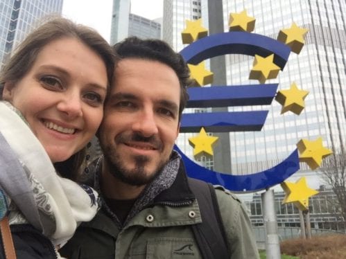 Logo ali pertinho fica a Euro Tower, com seu famoso monumento: o símbolo do Euro. Paramos pra tirar aquela foto clássica! 🙂