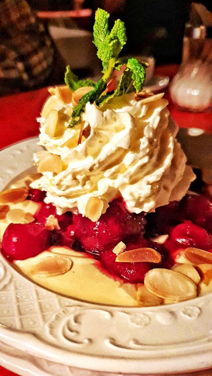 Sobremesa: essa pode ser uma ótima oportunidade de provar a principal sobremesa alemã de Hamburgo, a ‘rote grütze‘. A receita consiste em uma compota de frutas vermelhas servida com calda de baunilha e/ou chantilly. A porção é imensa e pode ser dividia por duas pessoas. Perfeita para encerrar o jantar e a noite no Restaurantbetrieb Krameramtsstuben.