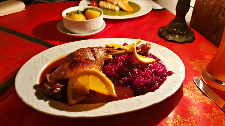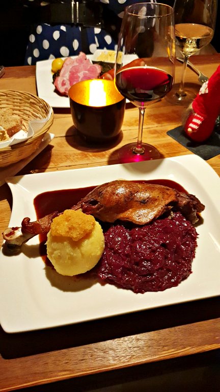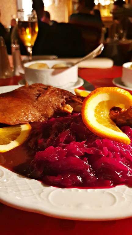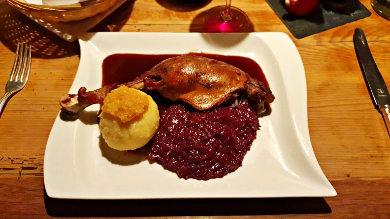 Pratos principais: Um dos pratos do menu fixo era o Curly Cale – Dorf Style (carne de porco defumada, salsicha, Couve-lombarda, mostarda e batatas caramelizadas). A outra escolha foi um prato tradicionalíssimo dos menus de inverno em toda a Alemanha: Crispy Goose Leg on a Delightful Lavender-Honey Sauce, with Homemade Red Cabbage and Original Thurigian Potato Dumpling (coxa de ganso assada e crocante com repolho roxo e dumpling de batata). Ambos servidos em porções bem caprichadas e deliciosos no sabor.