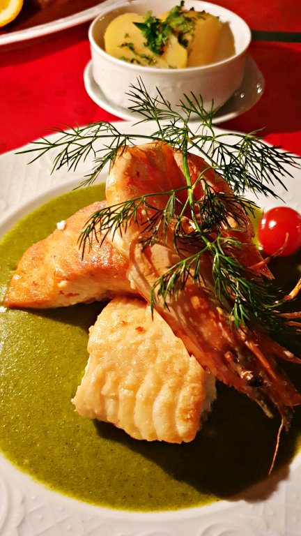 filetes de salmão assado, guarnecidos com camarão de caça, servido com creme de endro e batata com manteiga