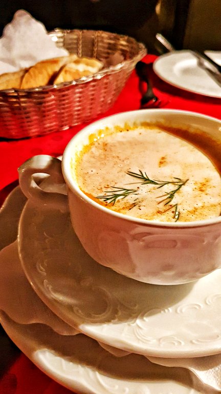 Entradas: Para a entrada, as “sopas do dia” costumam ser ótimas opções, especialmente nos dias mais frios. No dia do nosso jantar, as opções eram: Cream Soup of Sprouts with Fried Bacon-Bread (sopa de couve de bruxelas com pão de bacon) e Creamy Soup of Purple Cabbage and Walnuts with Smoked Stripes of Duckbreast (sopa de repolho roxo e castanhas com fatias de peito de pato defumado). As porções não eram grandes, mas estavam super saborosas e perfeitas para aquecer do frio.