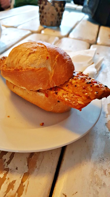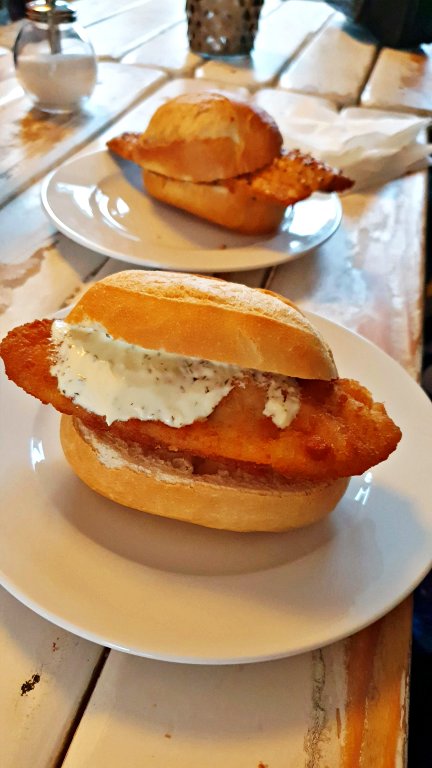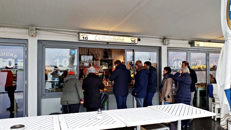 Todos em busca de uma das iguarias mais tradicionais de Hamburgo: o fischbrötchen. Nada mais é do que um sanduíche de peixe. Nele, um pão semelhante ao nosso pão francês é servido recheado com arenque – que na receita tradicional é servido cru ou apenas defumado. Mas existe ainda a opção do peixe empanado e até algumas variações de recheio, como camarões ou outros peixes como o salmão defumado. O sanduíche costuma vir ainda com cebolas, picles ou algum molho, a depender da escolha. Os preços são super acessíveis, o serviço é rápido e o movimento é frenético. Se você deseja experimentar o fischbrötchen e ao mesmo tempo viver uma experiência autêntica de Hamburgo, o Brücke 10 é o lugar!