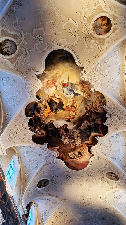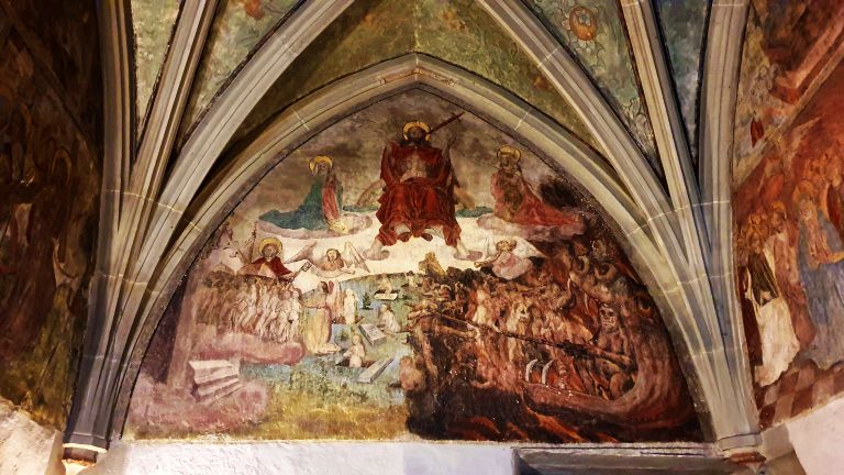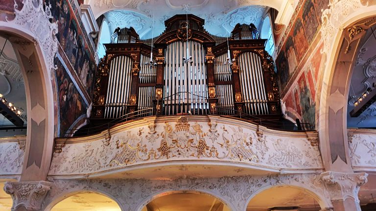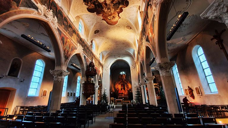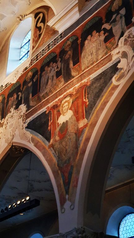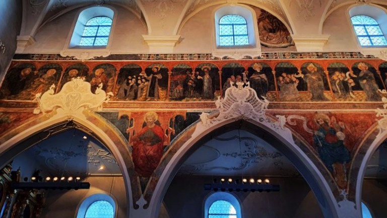 No interior da Igreja construída no final do século XIII, a arquitetura combina o estilo gótico tardio com pinturas e elementos decorativos de estilo barroco. Os maiores destaques ficam por conta dos espetaculares afrescos e do órgão.