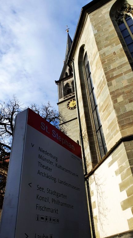 Saindo dos limites oficiais do bairro de Niederburg mas ainda no centro histórico de Konstanz, outra importante igreja está localizada a poucos metros da praça da Catedral. A Sankt-Stephans Kirche (Igreja de São Estêvão) fica na praça de mesmo nome e é considerada a igreja mais antiga da cidade. Sim, se a Konstanzer Münster possui registros documentais a partir do ano 780, a Sankt-Stephans Kirche é mencionada em documentos do ano 680! O interior não é tão sofisticado e imponente como o da Catedral, mas ainda assim vale muito a pena dar uma passadinha por lá.