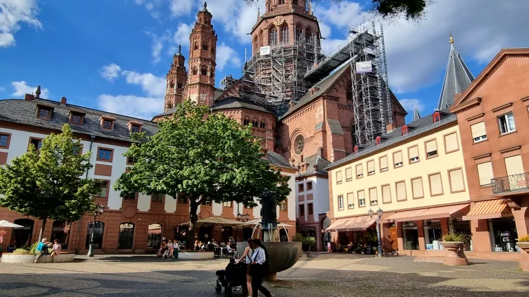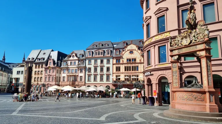Da Liebfrauenplatz, siga para a Marktplatz, ou Praça do Mercado, local que tem sido o centro nevrálgico de Mainz desde a Idade Média. No coração do centro histórico, a Marktplatz é de fato a praça mais bonita e emblemática da cidade. Cercada por edifícios históricos de uma arquitetura impressionante e pela imponente Catedral de Mainz, a Marktplatz é uma mistura fascinante de estilos que refletem as diferentes eras pelas quais Mainz passou — das fachadas em estilo enxaimel às estruturas barrocas, cada edifício ao redor da praça contribui para a atmosfera única e charmosa do local.