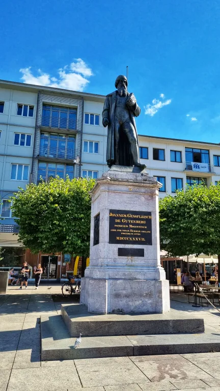 Na sequência, é hora de seguir até ouro local da cidade que faz referência a Johannes Gutenberg. A Gutenbergplatz (Praça de Gutenberg) é uma das praças mais importantes e animadas de Mainz. Com direito inclusive a uma estátua de Johannes Gutenberg em bronze, localizada em posição de destaque.