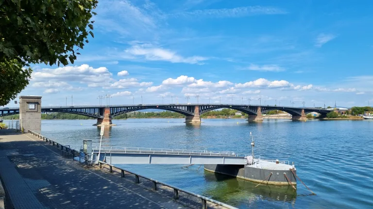 Partindo da referência do centro histórico e seguindo para a esquerda de quem está de frente para o rio Reno, em uma caminhada de cerca de 10 minutos você chegará até a ponte Theodor Heuss (que cruza o rio Reno em direção à Wiesbaden, cidade que também recomendamos a visita caso tenha mais de 1 dia em Mainz).
