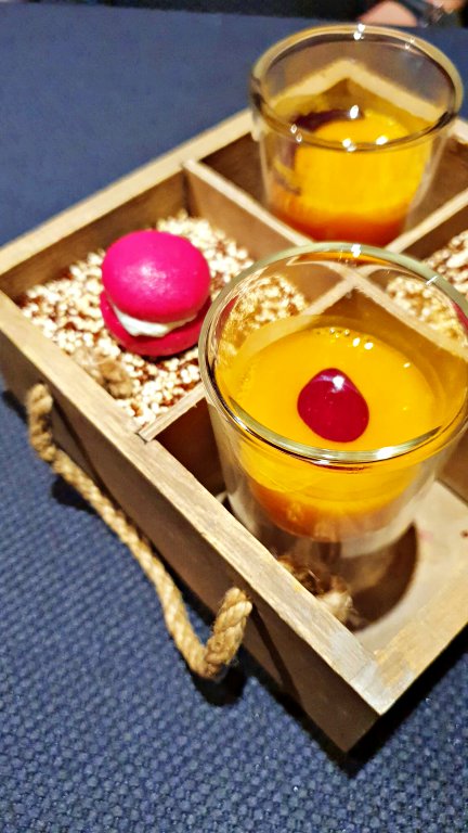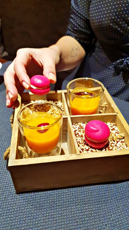 Na sequência, ainda antes da sequência de passos propriamente dita, foi servido um aperitivo de belíssima apresentação: caldo quente de abóbora com macaron de beterraba recheado com queijo cremoso.