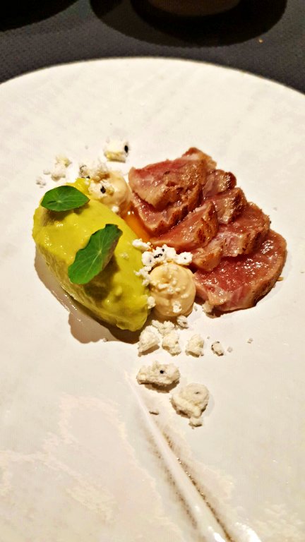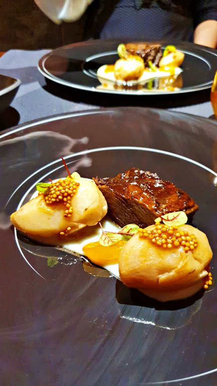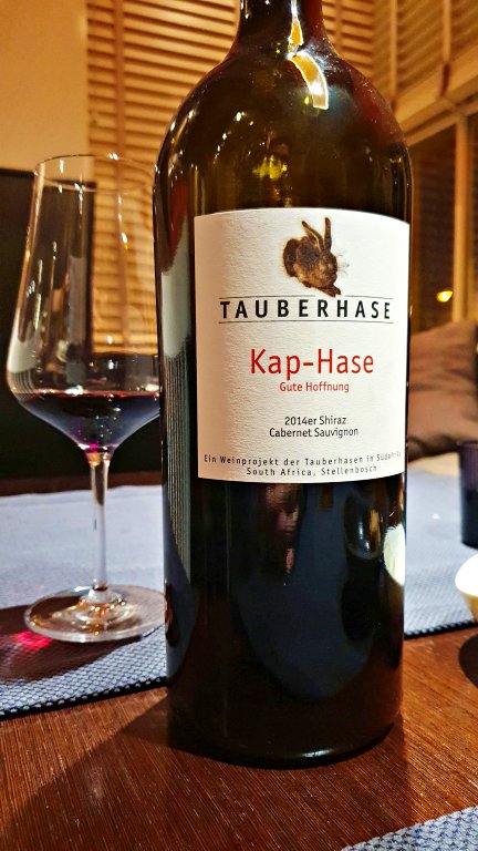5º serviço – Old Milk Cow: Na sequência, um vinho tinto sul-africano produzido especialmente para o restaurante que harmonizou com o prato de carne, com o curioso nome de Old Milk Cow. Este prato é preparado à base de uma carne bovina selecionada e especial, muito rara de encontrar na região. A carne é marinada e cozida durante muitas horas, atingindo ótimo sabor e textura.