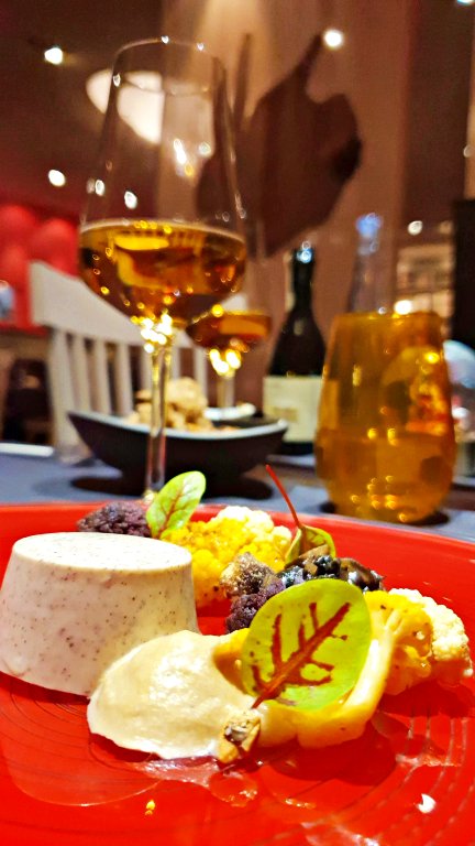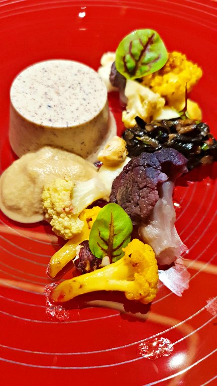 2º serviço – Colorful Cauliflower: O nome representa bem o que é o prato, Couve-flor Colorida. Este prato trouxe diferentes apresentações de couve-flor, não apenas com cores variadas mas com preparos diversos. Interessante para ver a gama de sabores alcançados a partir de um mesmo ingrediente. O prato vem acompanhado de panacota de castanhas. A bebida parece vinho, mas era uma bebida de maçã não alcoólica.