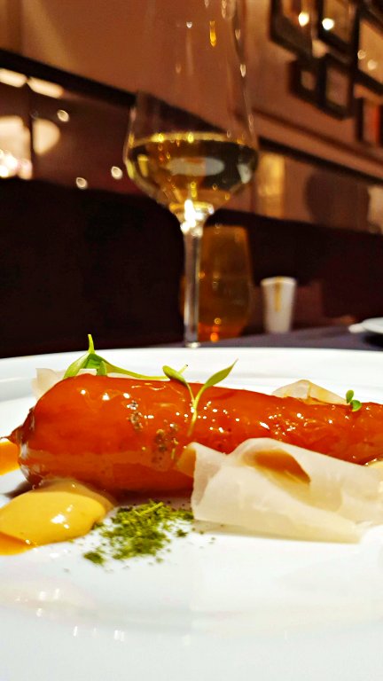 3º serviço – Carrot from Kellerhof: O vinho Riesling de produção da região foi o elencado pelo Chef para acompanhar o terceiro passo: Cenoura de Kellerhof. Além da própria cenoura caramelizada, o prato se utiliza ainda de seus talos e folhas para os diferentes molhos e apresentações.