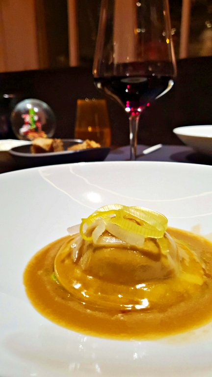 4º serviço – Ravioli de Pato servido com alho poró e acompanhado de rutabaga, uma verdura local típica. O recheio incrivelmente saboroso harmonizou perfeitamente com o vinho tinto de uma uva que só se cultiva nessa região: a Tauberschwarz.