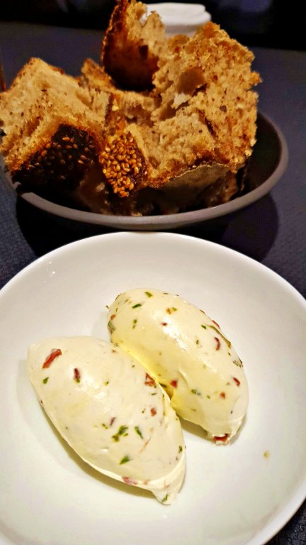 Aperitivos: o serviço começa com 2 taças do espumante da vinícola TauberHase , o Hasi. Os pães artesanais são servidos ainda quentes, acompanhado de manteiga de ervas.