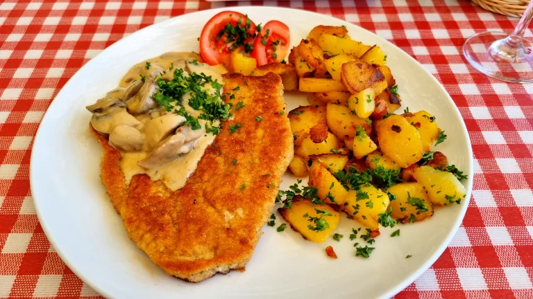 Entre os pratos mais tradicionais da casa, uma das sugestões é pedir o Schnitzel “Wiener Art” (típico bife empanado alemão, servido com batatas fritas/coradas e molho de cogumelos). Um ótimo e autêntico schnitzel preparado na hora e servido em uma porção generosa, perfeito para quem é fã desse clássico austríaco/alemão. Outra bela dica é o hamburguer que leva o nome da casa, o Rebenhaus-Burger — um sanduíche super completo, servido com enorme porção de batatas fritas. Dois pratos de preparação rápida e ótimo custo-benefício, perfeitos para repor as energias no momento da parada para o almoço e seguir explorando a cidade de Rüdesheim.