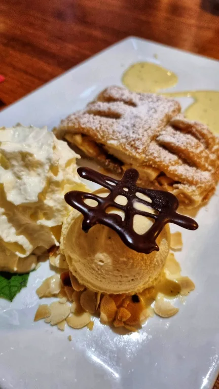 Encerrando o jantar no Breuer’s Rüdesheimer Schloss, a sobremesa mais tradicional da Alemanha: apfelstrüdel (torta de maçã) servida bem quentinha com sorvete, chantilly e calda de baunilha. Sem dúvidas, a melhor forma de terminar um dia perfeito em Rüdesheim am Rhein.