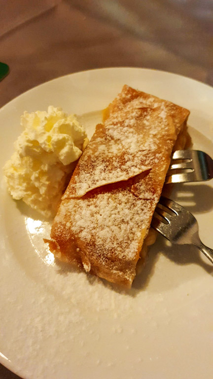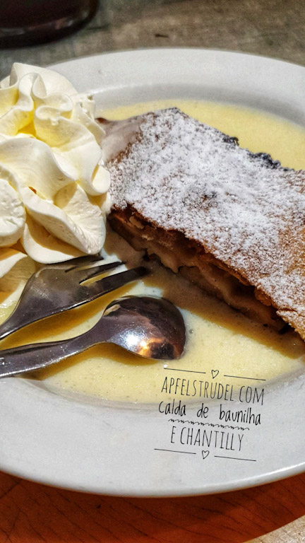 Sobremesa típica: Apfelstrudel com calda de baunilha e chantilly + café