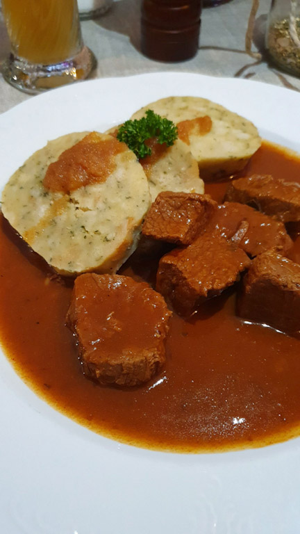 Prato de carne ensopada com knodel. Cores muito vivas. Onde comer em Bregenz: Pfänderdohle Gasthaus: Gulasch com knödel