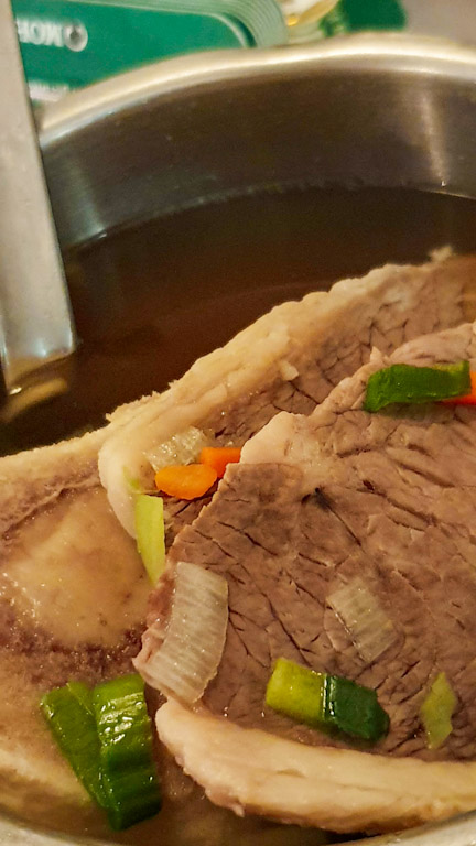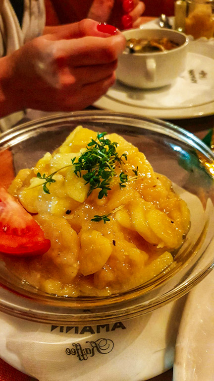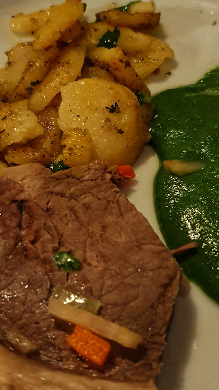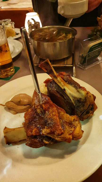 Mas o menu de tradições do Goldener Hirschen é amplo, incluindo vários pratos a base de carne bovina, carne de caça e no inverno aves como ganso e pato. Outra receita que pode estar no menu de sugestões do dia é Knuspriges Schweineknie – joelho de porco crocante de 1,5kg! Sim, é isso mesmo. Um porção de um quilo e meio de joelho de porco assada com acompanhamentos: a tradicional salada de batata, mostarda e uma verdura da estação.